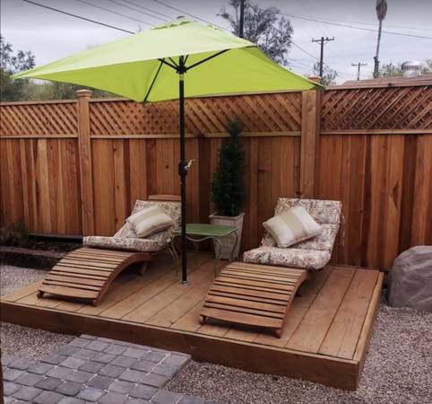 This tiny home has 1 bedroom and 1 bath, a kitchen, living room and HDTV. Covered patio with furniture (bistro table + 2 chairs, 2 sofa chairs, outdoor coffee table and BBQ. Sun deck, sun lounges and umbrella.