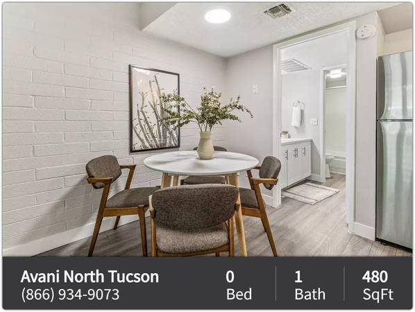 Located in the heart of Tucson, Arizona where luxury living meets convenience. We pride ourselves on exceptional customer service and a welcoming community. Our spacious pet-friendly studio & one-bedroom apartments were designed with your comfort in mind. Having local attractions nearby is part of selecting the right home, right? Living at Avani North Tucson you'll have access to multiple dining, shopping, and entertainment options right off Alvernon Way & Grant Rd. If you're someone that enjoys nature we are also located near the flourishing Tucson Botanical Garden as well as Rillito River Park. University of Arizona & Pima Community College is just a short drive away.