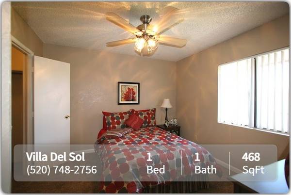 Villa Del Sol Apartment Homes is located on the southeast side of sunny Tucson, Arizona at 6775 East Golf Links Road. We offer all the perks of urban living without the hassle, and are conveniently located less than 5 minutes away from D.M.A.F.B, major shopping, entertainment and dining! Our friendly east side Tucson community offers studio and one bedroom floor plan apartments for rent... and each unit comes equipped with a gourmet kitchen, spacious walk-in closets, color-coordinated interiors and individually controlled heating, air conditioning and more! We're also a pet friendly community, so your furry friend comes with you! Come check out our great eastside Tucson apartments today!