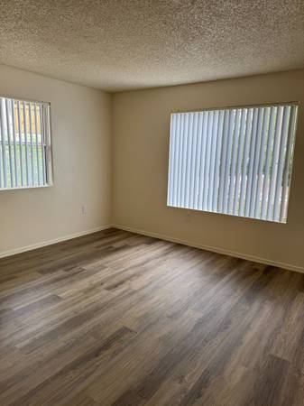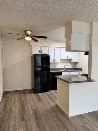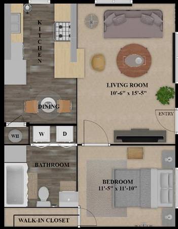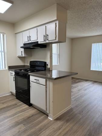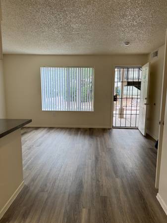This apartment features beautiful wood vinyl flooring that flows from the dining area into the kitchen and living room, creating a seamless and stylish space.