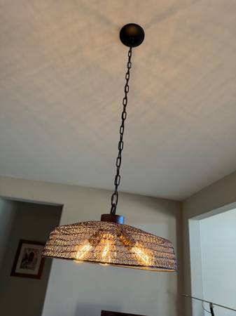 Modern Farmhouse Metal, Geometric Chandelier- Three lights, Adjustable chain for correct length. Color Dark Brown $ 85.00 Cash Only Please, provide a number . Thanks,