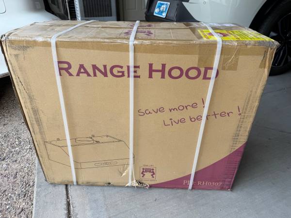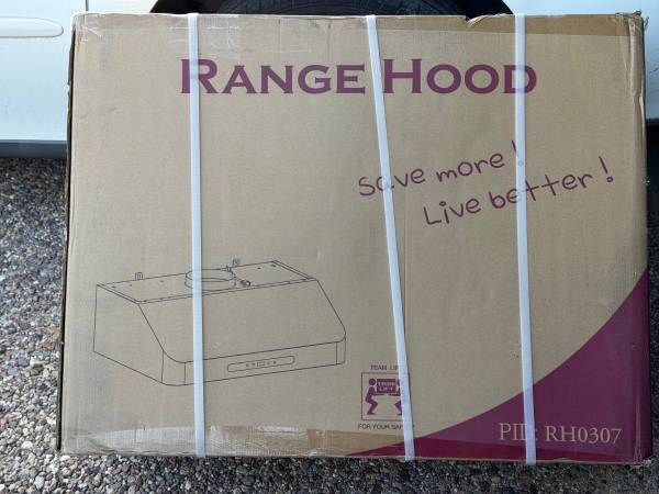 Brand new 30 inch wide range vent hood, still in the box. Fits in cabinet space above stove/range, same width as above-range microwave. Item is still in the box, with straps uncut, so I have no pictures of the hood itself to post. I am including pictures of the unopened box. Here are some links to posts that have pictures of the item and to a YouTube video posted by the manufacturer. Item was somewhere around $250+ when purchased new. Cash only, please. Will entertain serious offers (in other words, O.B.O.)