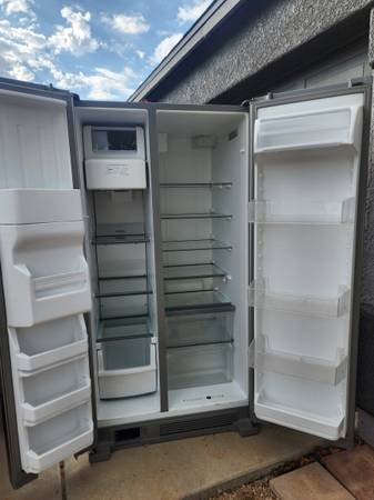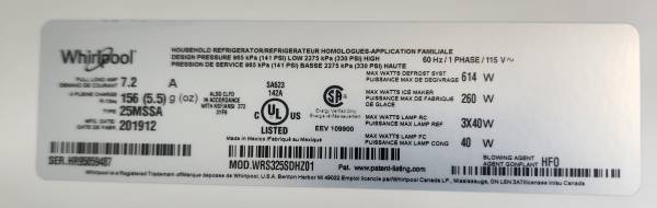 Model: Whirlpool WRS325SDHZ01 - was working perfectly until moved to garage and kept unplugged for about 3 months. Also has a broken plastic water filter door cover, but water and ice worked fine. Fingerprint-Resistant Stainless Steel Finish. Dimensions: 36-inch wide