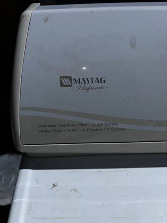 Excellent clothes dryer - nothing fancy, easy to use knobs, MAYTAG PERFORMA "Quiet Series" "Heavy Duty" "High Capacity" model PYE2300AYW with 7 cycles. Call or text FIVE-20-400-53-FIVE-FIVE