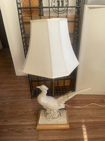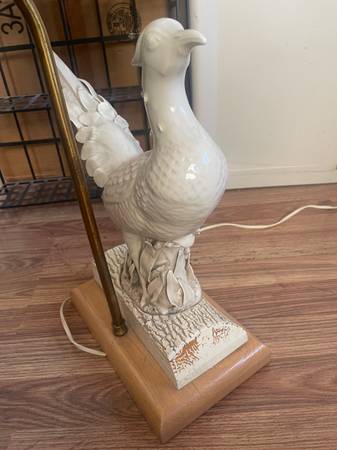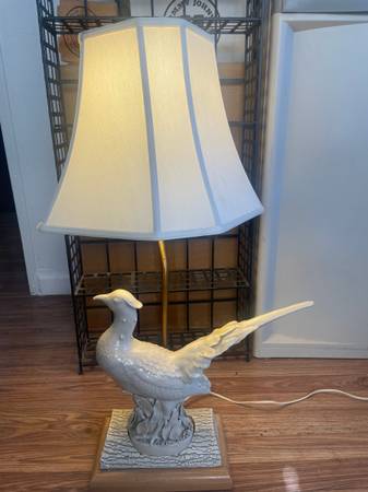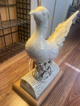 Vintage white porcelain pheasant lamp, likely from the mid-20th century. This measures: 16 inches wide x 6.5 inches deep x 15.5 inches tall bird or 31.5 inches tall with lamp shade. Asking $200. (on eBay these sell for $1200).