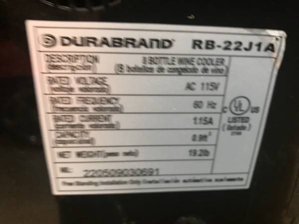 Durabrand Wine Cooler, 8 bottle. Very clean, no scratches, dents, etc. Countertop model. Functions but will need a new cooling fan, easy fix, $10 for the new fan, easy install. First $20.