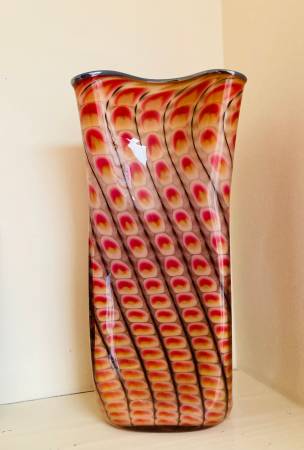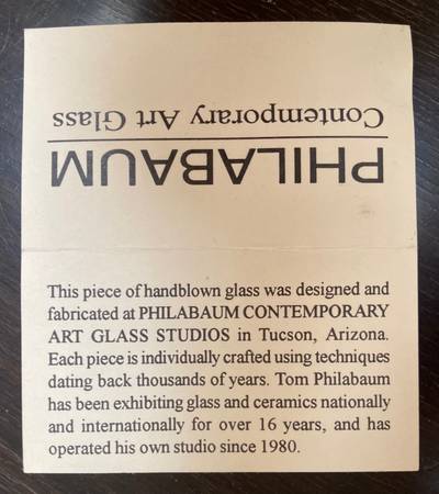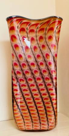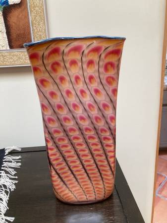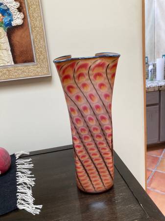 This rare vase was produced in the Tucson studio of Philobaum studios in Tucson, AZ by Eric Depan. A similar vase is selling at the elite Philobaum gallery for $2200. The vase stands 14 1/2 inches tall, and is 7 inches wide at the top/ 5 1/2 inches in the body, and 4 inches across. It is one of a kind and dates from the early 21st century. I will pack and ship this vase to you for an additional $50, or you can arrange to pick it up in Santa Fe or Albuquerque New Mexico.