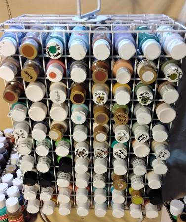 Acrylic Paint, 2 oz. Bottles, Miscellaneous Colors. (249) new Bottles, (40) Used. Major brands Apple Barrel, Crafting Smart, Americana and more. Includes spinning rack that holds (160) bottles.