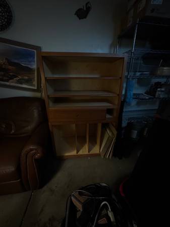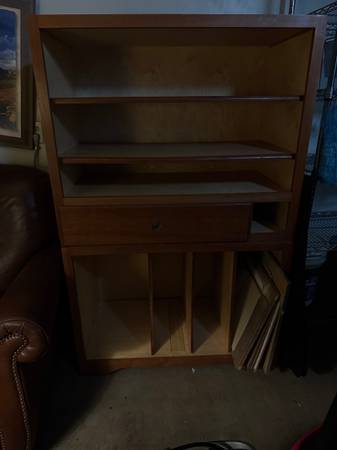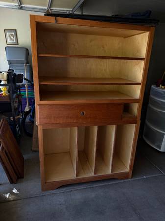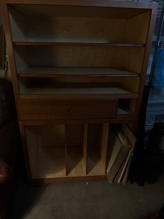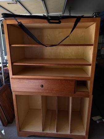 Solid wood art cabinet! Perfect place to sort larger size canvas or wood pieces on the bottom and an area for paint on the top shelf. Comes in two parts which is good because it is heavy! Approx 40.5 inches wide and 63 inches tall. 22 in from wall to front of cabinet. The pics are dark (also the reason the art studio didn’t work out here—too dark). 110 cash