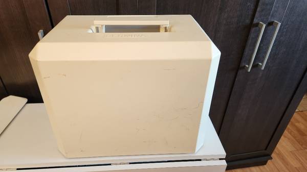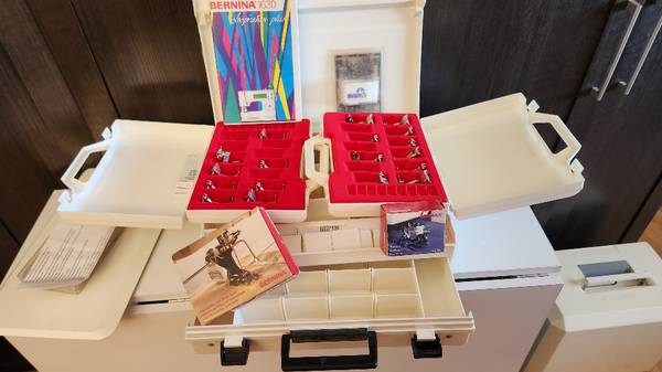 This machine has seen very light use and includes a pleathra of attachments and documentation. The foot pedal and knee lever are included but not show. Everything is pretty much like new. Recently serviced by Cathy's sew and vac. Would be willing to part out some attachments separately.