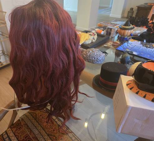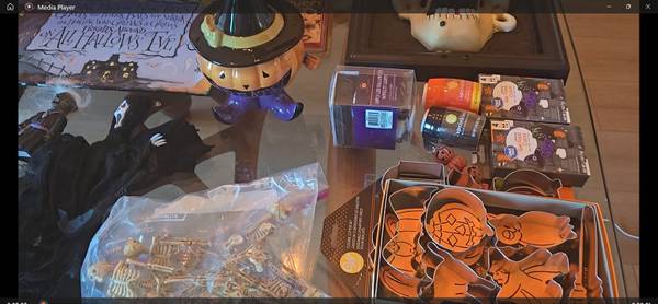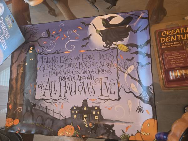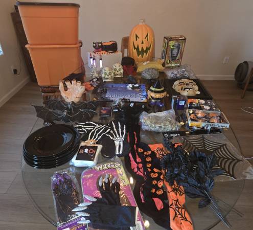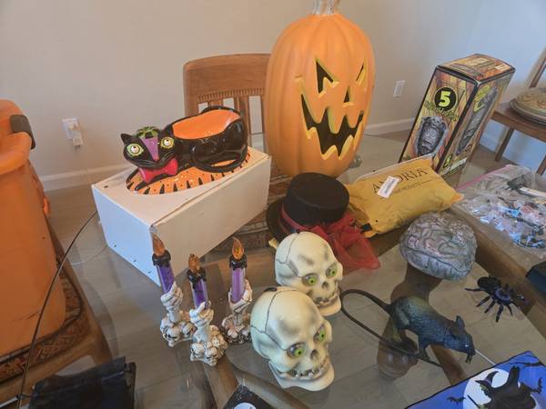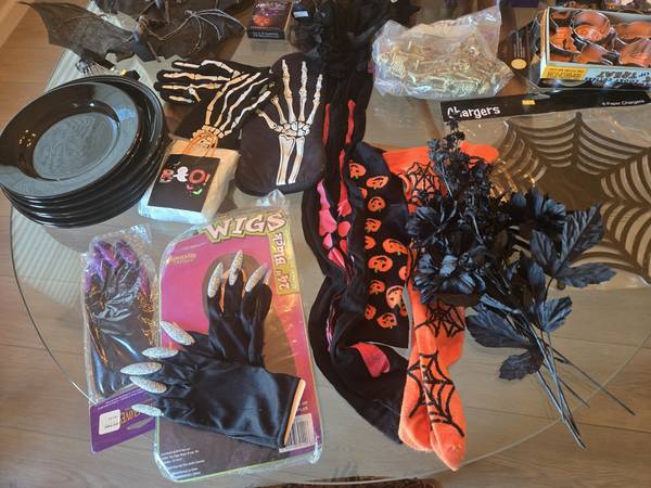 Various Halloween items: black dinner plates, black flowers, black and red wigs, unused socks, bats, spiders, rat, cookie cutters, unsued gel food colors, unused sprinkles, skeleton gloves & decoations, vairous lights, lit pumpkin, platter (repaired), hat, candle holders, wall art, mechanic brain, squirt door knocker, etc. In 3 plastic containers (those are worth $50 alone!!!)