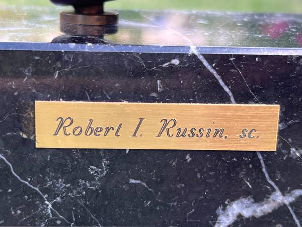 Robert Russin American Artist: b. 1914-2007. Robert Isaiah Russin was an American sculptor, artist and University of Wyoming professor. He was best known for a number of public sculptures throughout the United States, including the "Spirit of Life" fountain sculpture located at the City of Hope National Medical Center in California and a giant bust of Abraham Lincoln, the Abraham Lincoln Memorial Monument, located on I-80 in Wyoming. Russin was known for his public sculptures, by one account numbering more than 400 worldwide.