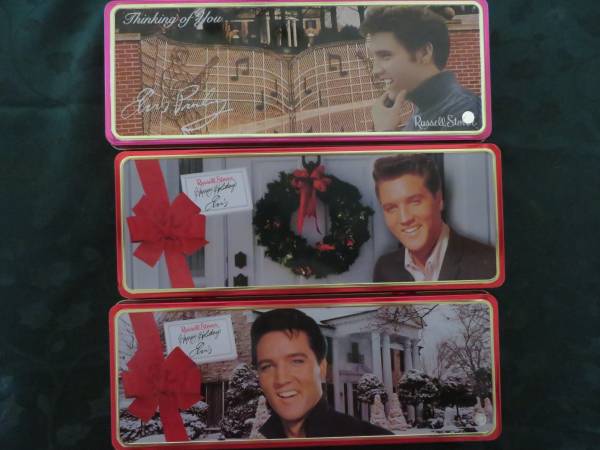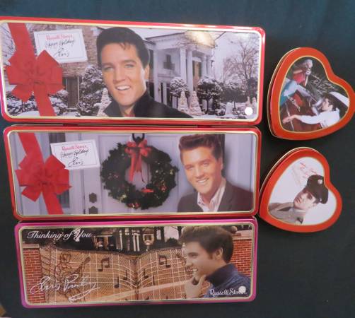 Vintage Elvis Presley Collectible and Rare Tins. There are 3 of the long tins. The long tins measure 12.5 inches by 4.5 inches. There are 4 of the heart shape tins. The heart shape tins measure 5 inches by 4.5 inches. All of the tins are in excellent like new condition inside and out. Great Gift for Christmas, Valentines Day, Mother's Day, or Birthday. $5 Each