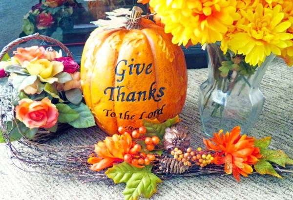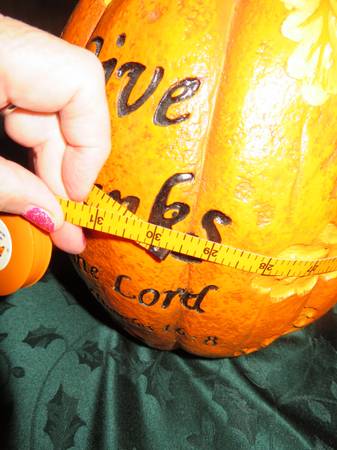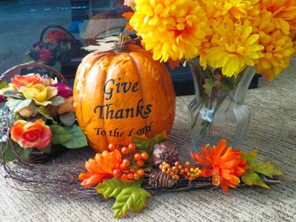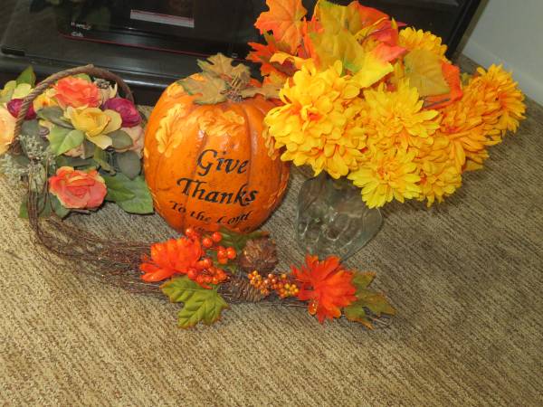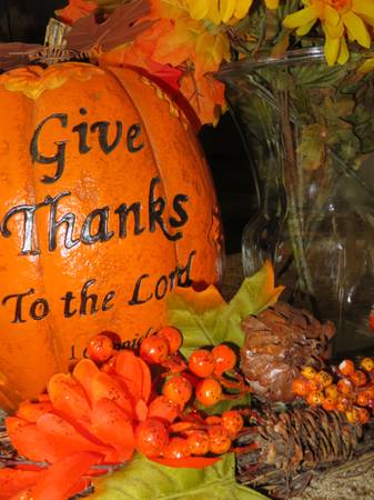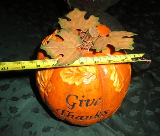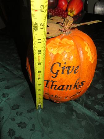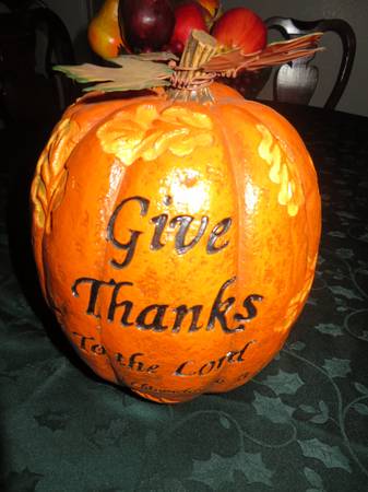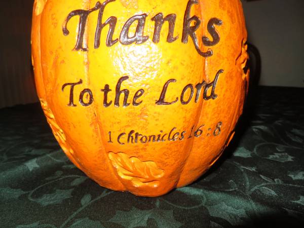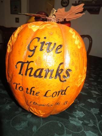 Thanksgiving "Give Thanks" Extra Large Polyresin Pumpkin with inscription, "Give Thanks To The Lord" "1Chronicles 16:8". It makes a beautiful Thanksgiving table centerpiece or display with fall flowers. 12" Tall x 7" Wide. Excellent Like New Condition. $30