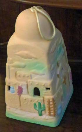 Large Southwest Native American Hand Painted Wind Chime Bell with pastel colors of a southwest desert scene home. There is a very small spot at the top of the bell where some paint has faded (see pictures), otherwise in excellent condition. $10