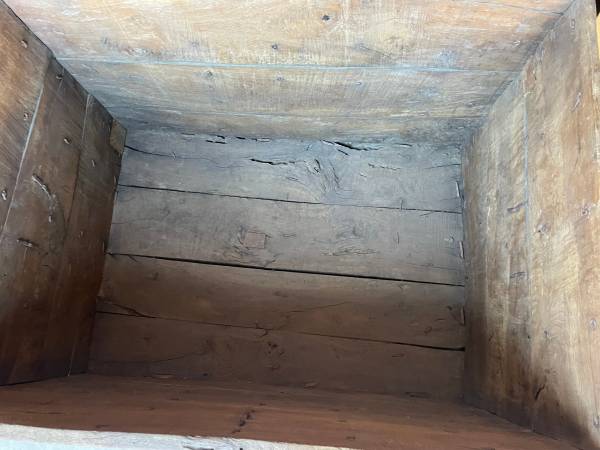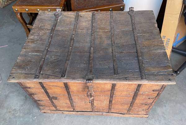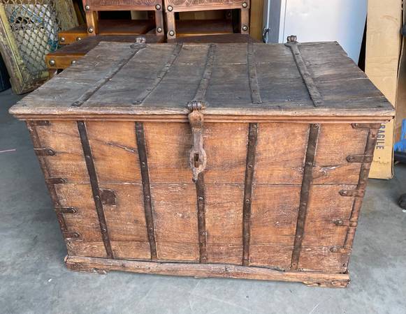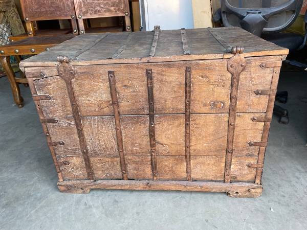 Antique Teak wood trunk from Rajasthan India from the 1890's. This is in good condition for it's age; still solid and ready to use. It is made from quality teak wood and wrought iron. It measures: 35.5" wide x 26" deep x 24" high. Asking $295
