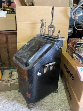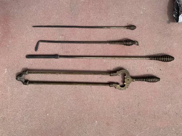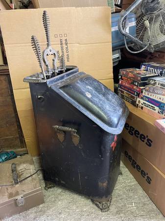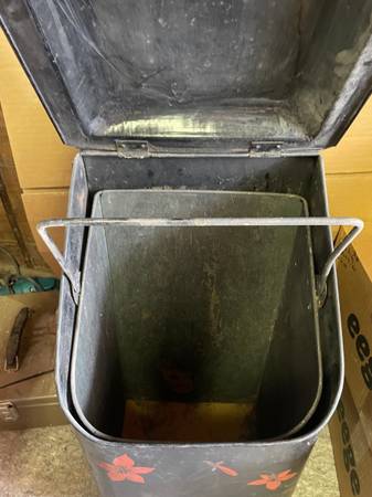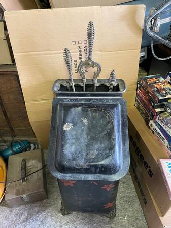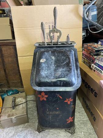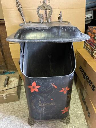 Antique Victorian Toleware Hand Painted Ornate Coal Scuttle Fireplace Ash Bin with 4 fireplace tools, also antique. It is in good condition with a dent on top and could use some cleaning. It measures: 13 inches wide x 15 inches deep x 24 inches tall. Asking $75