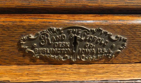2 pull out shelves on each side, interior fitted with Pigeon holes & drawers, four drawers on each side, one main center drawer. The Plaque around the keyhole reads, "The Rand Leopold Desk Co., Burlington, Iowa, USA."