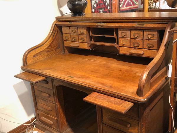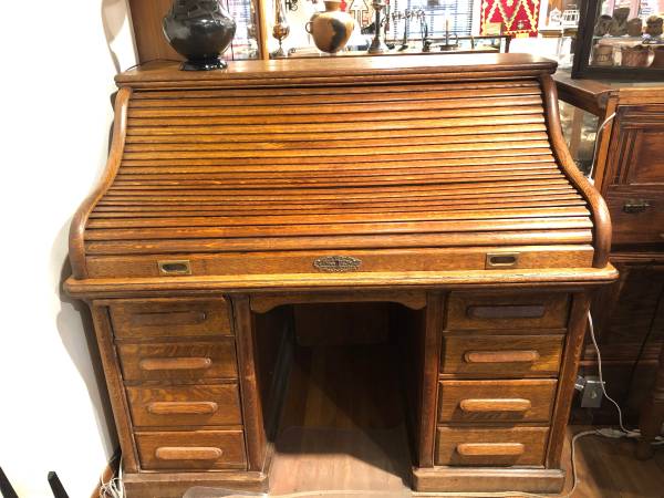 Measurements: 53 1/2" wide x 35 1/2" deep. Desktop height 30", Rolltop back 47" high.