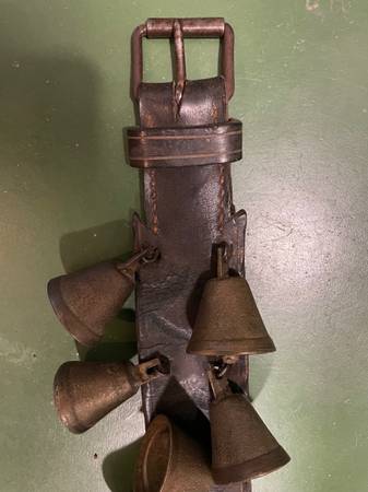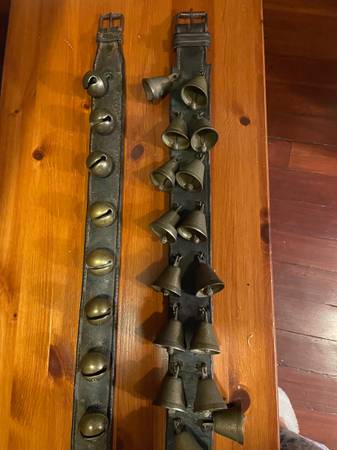 2 sets of sleight bells. Excellent shape and beautiful sound. Single bell - 40” long, 1 1/2 “ wide the leather- $150.00 Double bell- 40” 2” wide at leather -$ 200.00