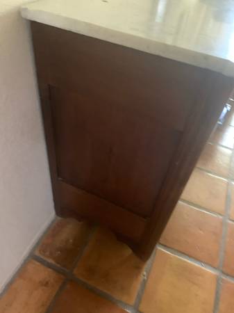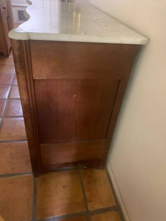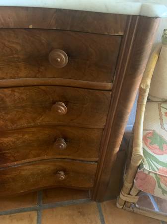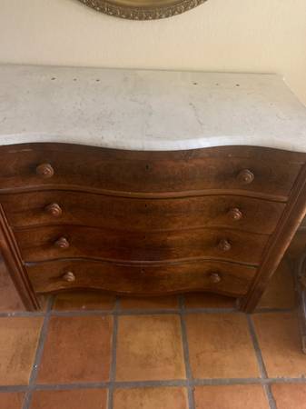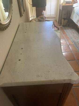 Victorian era (c. 1837–1901) Mahogany Marble Top Dresser in good condition. The dresser has a bowed front, a characteristic design element found in furniture from the 18th and 19th centuries. Measures 43 inches wide by 21/2 inches deep by 36 inches tall.