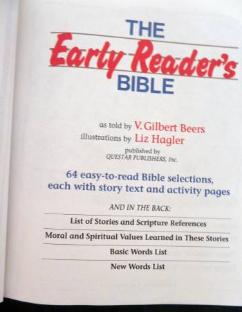 "The Early Reader's Bible" by V. Gilbert Beers. A Bible to read all by yourself! Fun to learn ...and easy to read...Hardcover with 64 easy to read Bible selections, each with story text and activity pages. For ages 3-8 years old. "Read To Me" Children 3 and up. "I Can Read" Children 5-8. Dimensions: 6 1/4 X 7 1/2 X 1 1/2 (inches). Includes sixty-four selections from the Old and New Testaments, plus questions, activities, and word lists. 527 pages. Excellent Like New Condition. $5
