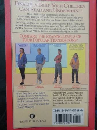 The International Children's Bible (Soft Cover), published in a translation perfect for elementary age kids, is filled with dozens of beautifully designed, color illustrations to help children visualize popular Bible characters and events. The International Children’s Bible®, created especially for children in the third grade and up, provides the ideal blend of readability and fidelity to the original meaning of the Scripture texts. $5 each