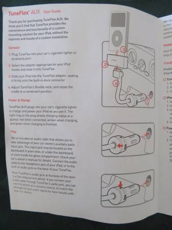 Griffin TuneFlex Aux-In i-Pod Car Stereo Kit to play i-Pod on car stereos. The easiest way to play, charge, and hold your i-Pod in your car. Plugs into Cigarette Lighter or Accessory Port to Charge and power your i-Pod as you use it. Includes audio cable connects directly to cars stereos that have Auxiliary-in Ports. Built in volume control. Like new with original box, includes TuneFlex Cradle and charger, 6 adaptors for i-Pod, 3 ft. audio cable, and instructions. $10