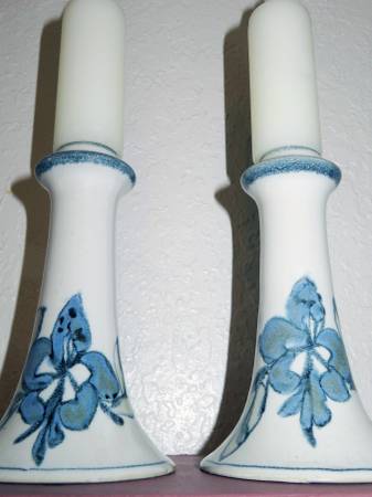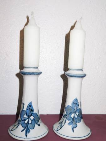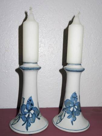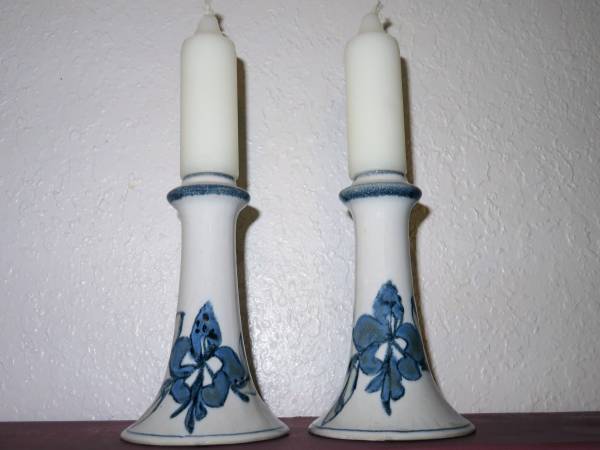 1 Pair of Lopez Pottery Candle Holders from Colorado. Vintage Pair of Handcrafted Pottery Candle Holders with hand painted Blue Columbine Flower Design. Vintage 1980s Colorado Pottery. Candles are not included. Height 6 inches, Width 3.5 inches. A great gift for Christmas, Mother's Day, Birthday, or any occasion. Excellent Like New Condition. $8 for the pair.