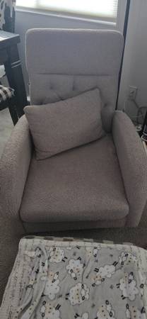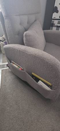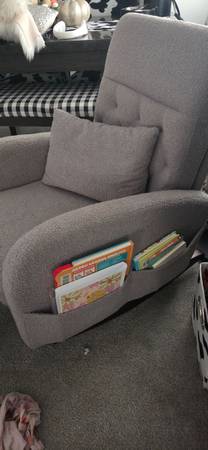 Barely used rocking chair with teddy bear fabric and pockets on each side for books. Very soft and comfortable.