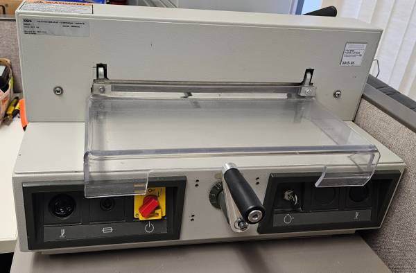 Rarely used Ideal 3915-95 Electric Guillotine Paper Cutter Trimmer .Reliable and efficient tool for accurately cutting paper and other materials. With a cutting capacity of 390mm (15 inches), this electric cutter is designed for precision and accuracy in various cutting tasks. Its model, 3915-95, ensures quality and durability, making it a valuable addition to any printing, graphic arts, or industrial setting needing a dependable paper cutter. Cutter Only. unit weighs approx. 200lbs