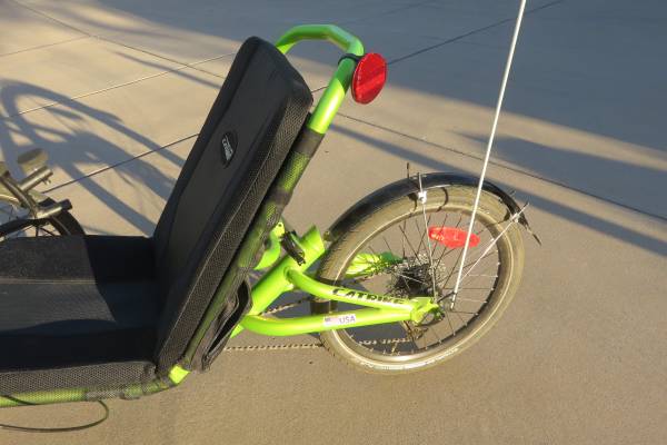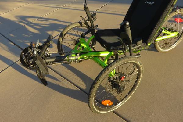 Like new condition with all systems functioning as designed. Very low usage and ready to go. 20" by 1.75" Schwalbe tires, AVID BB7_MTM Disc Brakes, SRAM Gx 10 speed rear cassette and 3 speed front derailleur, Dimension Terra Trike Pedals, Gossamer FSA crank, visibility flag, rear view mirror, rear fender and water bottle holder. The seat cushion is very comfortable and the seat back is adjustable, so you can find a very comfortable riding position. You won't be disappointed in its condition.