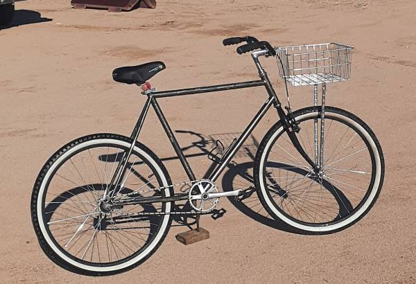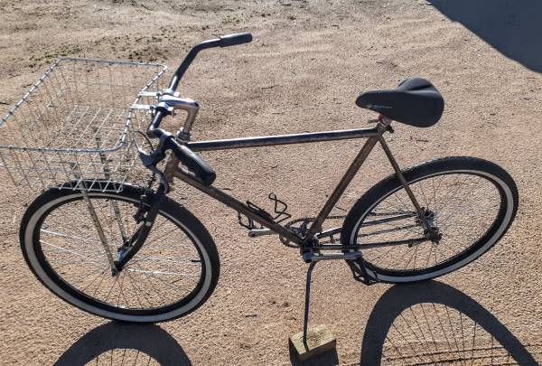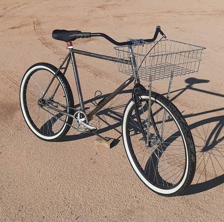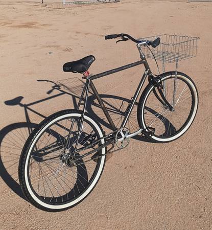 1980's Taiwan made Schwinn Sierra single speed/coaster brake cruiser conversion. All cromolly frame in size large (22"). Specialized fork with v-brake. All bearings cleaned and regreased. New chain. New mtb pedals. New Avocet gel saddle. Newer large Wald front basket. Well patinaed black chrome finish with clear coat to lock it in. 39 tooth chainring and 18 tooth rear sprocket for easy peddling. Ready to ride!