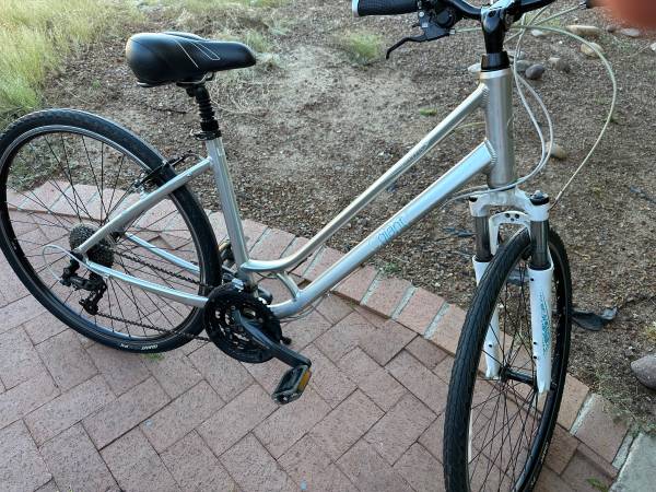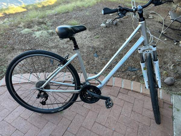 Step through bike in excellent shape , 700 c wheels , aluminum frame , front shock , 27 spd very comfortable ready to ride