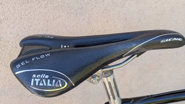 Twelve speed friction shifting is smooth and straightforward, and the Selle Italia Signo saddle is light and flashy.