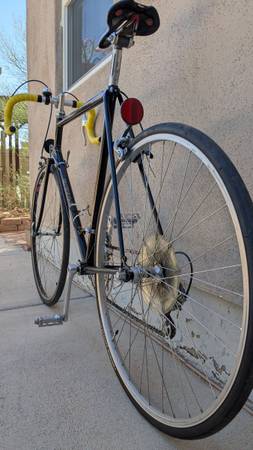 MKS Sylvana old school pedals, color-matched new school alloy bottle cage, and new yellow bar tape add to this bike's copious flare!
