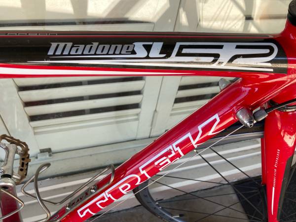 EVERYONE NEEDS A RED BIKE for the holidays! Trek Madone SL 5.2 road bike very good condition. Carbon fiber, ultegra, durace, excellent components. Fits riders 5'2"-5'4". Rims are 25" diameter; seat...