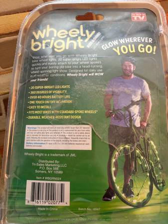 Wheel lights for your bike. Bran new in the container (container is open but not used and everything is there). I bought a few of these but didn’t use this set.