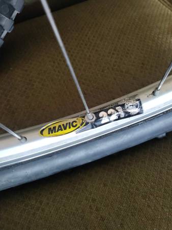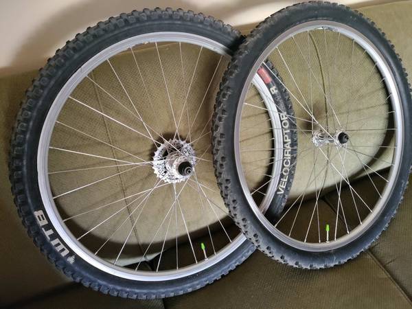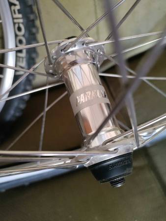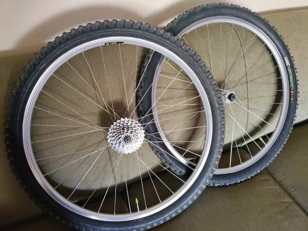 26" Mavic X221 MTB wheelset with Paralax XT hubs in excellent used condition. Includes 8-speed Shimano HG cassette and used tires. Wheels spin true and silent.