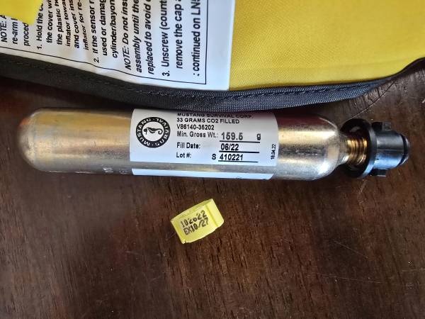 We have Mustang Survival MD-3083 self inflating PFD life jacket preserver available. It is adult size. It is used, but it still works as expected. It has had the CO2 cartridge and bobbin replaced. The expiration date for the new one is 6/29.