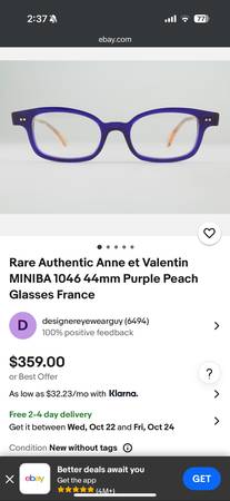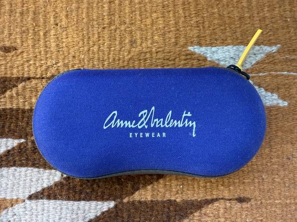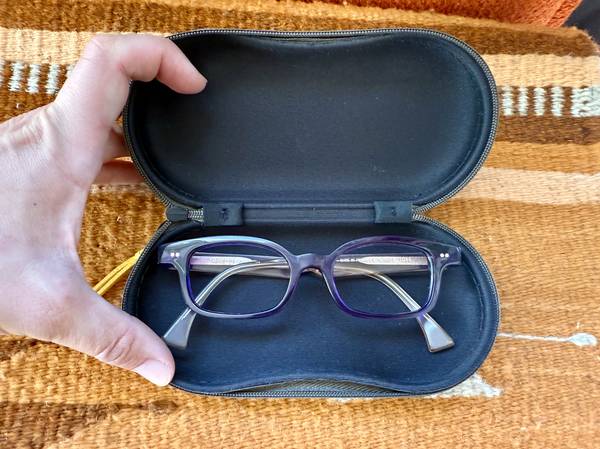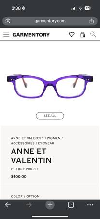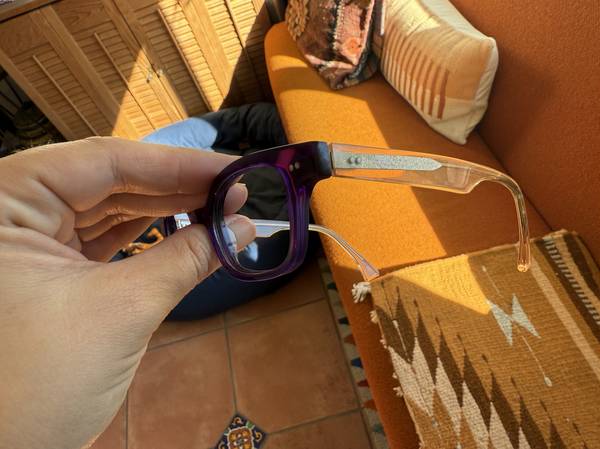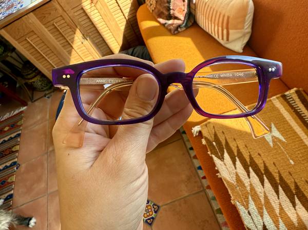 Miniba women’s fashion frames by designer Anne & Valentin. They are blue/purple depending on the light (see video), with peach/ light pink sides. No lenses, frames only.