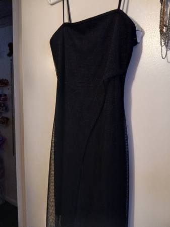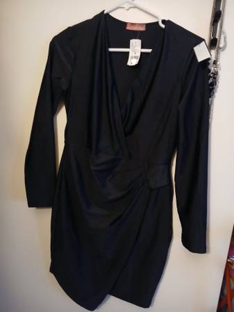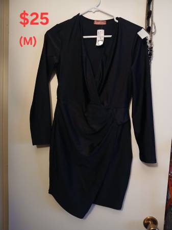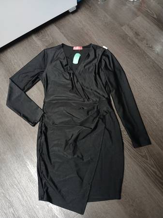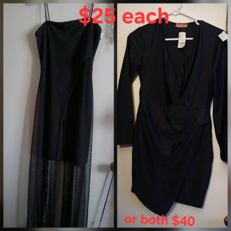 Never worn. With tags. Size Medium $25 each or both $40 Black dress with long sleeves is stretchy like spandex. Has design to enchance cinch waist for curves.