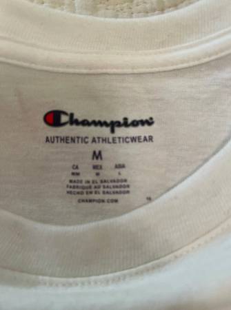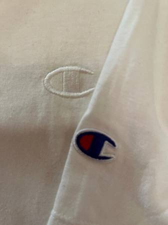 White Script Logo Champion T Shirt Fits True To Size Classic Champion Logo patch on Right Sleeve