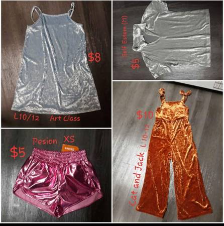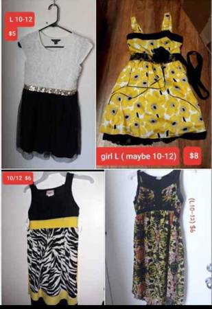 Lots of beautiful girl dresses. Most never worn.( See pictures for size and prices). Mostly 10-12. Some larger sized like 16 or adult small but will fit 10-15yrs old, Like vest, cardigan and leggings. I have a few more clothing that also fits 10-15yrs that I haven't posted.