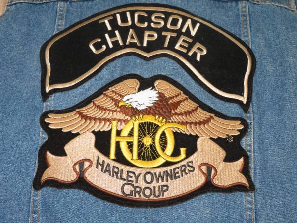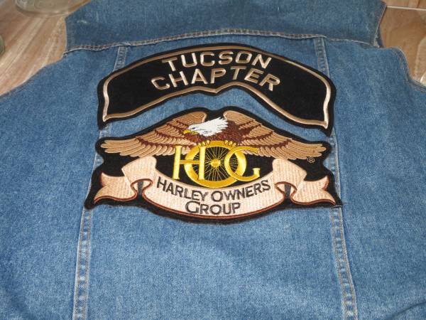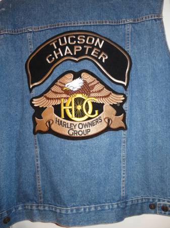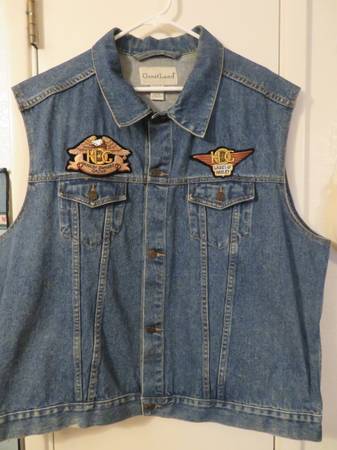 Denim Biker Vest with Harley Owners Group Motorcycle Patches on front and back of vest. Vest is Men's Size 2XL. Excellent Like New Condition. $40