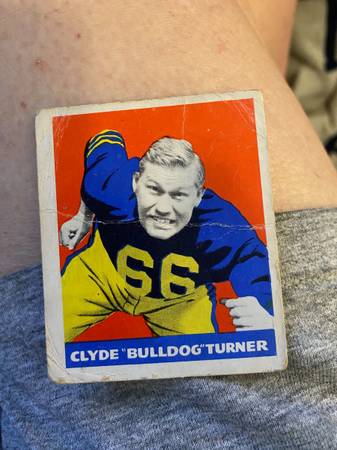This listing contains a 1948 Leaf Gum Football card. It is card #3 of the great Chicago Bear's HOFer Clyde Bulldog Turner. Although this card has not been professionally graded, I believe and the scans show the card to be in at least GD+ condition. Its major flaw is the crease across the middle of the card as scan 1 shows. A great buy for a 40s HOFer at a reasonable price.