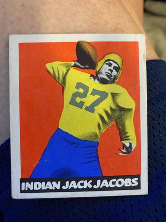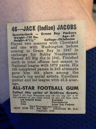 This listing contains a 1948 Leaf Gum Football card. It is card #46 of the great Green Bay Packer quarterback Indian Jack Jacobs. o. Although not professionally graded I believe and the scans to show the card to be at least VG condition with no creases and great centering in my opinion. A great buy for a 40s Leaf card at a reasonable price.