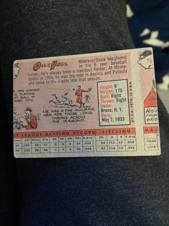 This listing contains a 1958 Topps Baseball card. It is card #100 of the great White Sox pitcher Early Wynn. What makes this card so unique is that it is a rare error card. It is early Wynn on the front but as is seen in the scans it is partially Ossie Virgil on the back. To make it more unique it is miscut on the back so you only see part of the Ossie Virgil card and the start of some other card that is either card 16 or a card in the 160s. Altough the card is in only VG condition its uniqueness adds to its desirability. A great buy for a very scarce card (maybe the only one) at a reasonable price.