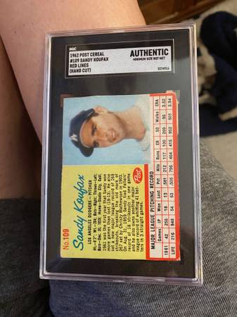 This listing contains a 1962 Post Cereal Baseball card. It is card #109 of one of the greatest left handed pitchers of all time HOFer Sandy Koufax. This cereal box card was hand cut as all of these Post cards are, and the scans show the hand cut issues. It has been professionally graded SGC Authentic and I believe the card to be in VG or better condition. A great buy for an early Koufax card at a reasonable price
