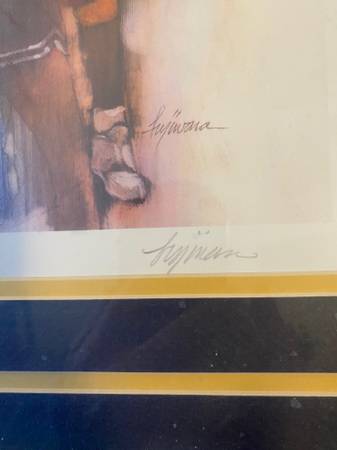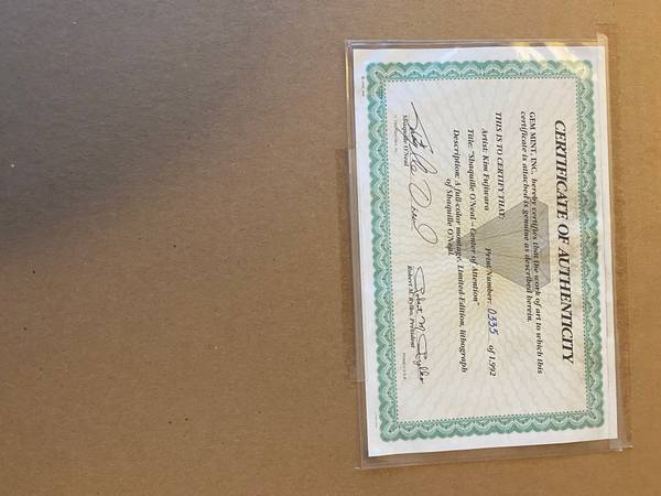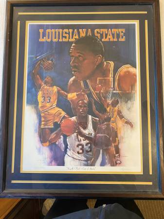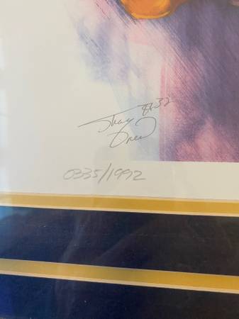 This listing contains a Kim Fujiwara limited Edition Montage Lithograph. It is the iconic " Center of Attention" lithograph of the college and Pro legend Shaquille O'Neil in his LSU years. This lithograph was limited to 1992 and is number 355. The lithograph has been signed by both Shaq and the artist Kim Fujiwara. I bought this lithograph new in 92 already framed. Agreat buy for an iconic work of art at a reasonable price.